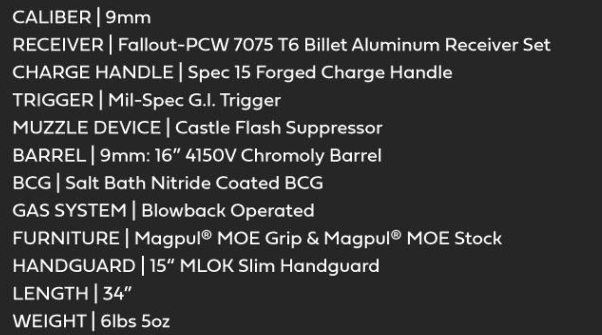BRO-PCC-9MM-SI 16" FALLOUT PCW RIFLE ANODIZED BLACK
